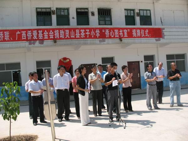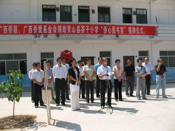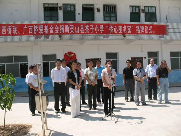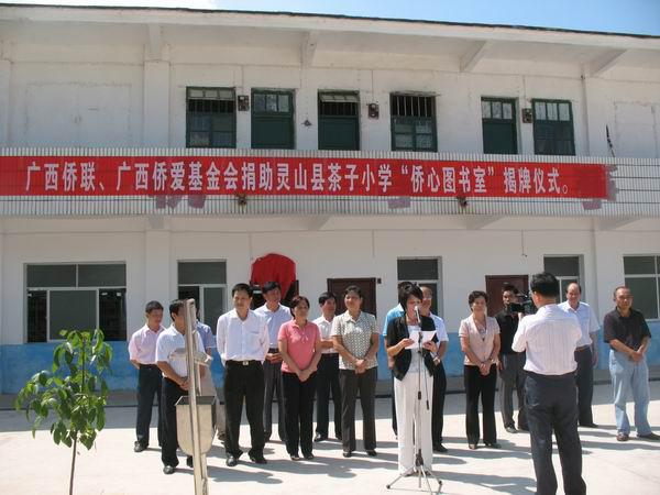 广西华侨爱心基金会是广西侨联领导下的非营利性社会团体,多年来一直致力于实施侨心工程项目,支持援建侨心学校,资助品学兼优的侨生之星。灵山县那隆镇茶子小学现有学生850余人,其中100多名学生是东风华侨林场职工的子女。在市侨联的指导和关怀下,2005年,茶子小学顺利获得自治区侨联捐资20万元,为学校新建一栋教学楼。如今,广西侨联、广西华侨爱心基金会又再次伸出援助之手,向茶子小学捐赠价值六万三千元的小学生课外读物新书共2377册。这批书籍极大地充实了学校课外读物数量和质量,进一步丰富了师生文化生活。