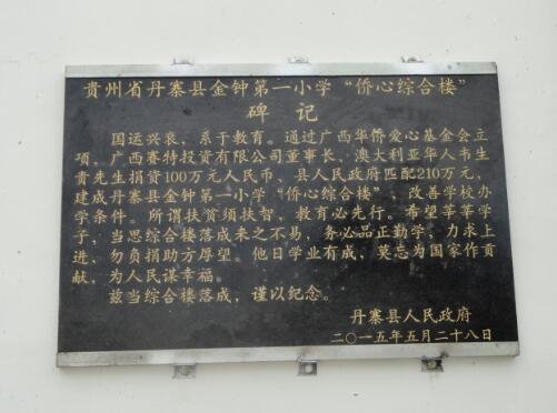 贵州省丹寨县金钟第一小学,于2015年5月建成,由澳华房地产有限公司资助100万元,县政府配套210万元建成。此行到丹寨金钟第一小学调研,基金会常务副理事长韦穗奇特别强调,一切按照“中央八项规定”严格执行,不要捐赠学校接待,不举办任何仪式,一切以不给受助学校添麻烦,不给学校师生增顾虑为准则。