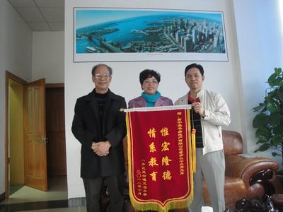 图为屈春秀主席(中)向韦生贵先生(右)、华侨爱心基金会副会长韦穗奇(左)赠送锦旗