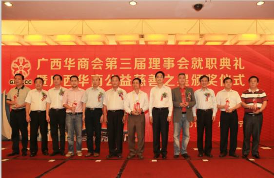 5月30日在广西华商会第三届理事会就职典礼暨广西华商“公益慈善之星”颁奖仪式,广西侨联、广西华商会、广西华侨爱心基金会为多次支持广西公益慈善事业的侨界爱心人士进行表彰,授予韦生贵、覃展敏等6位爱心人士“公益慈善之星”称号,为肖开宁、马相邕等12位爱心人士颁发“公益慈善纪念”奖,鼓励他们踊跃投身慈善事业,引导更多的人、更多的社会资源参与慈善活动,汇入献爱心的洪流之中,以自己的点滴行动,昭示和弘扬“人人皆可慈善”的理念。