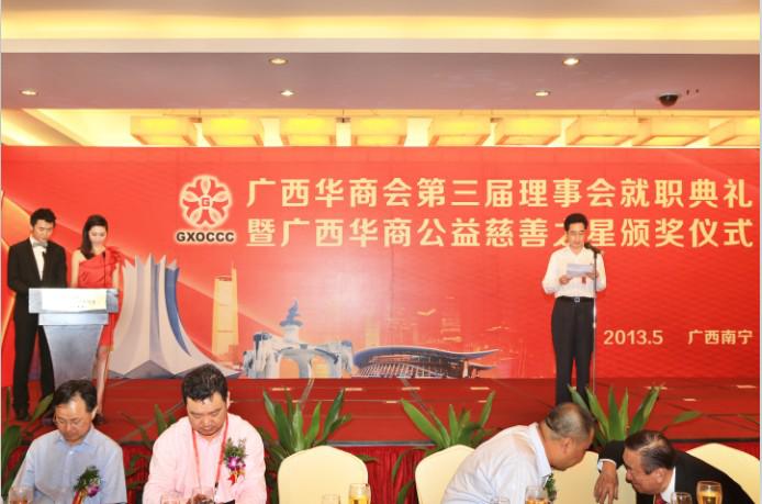 本网消息:2013年5月30日17时,广西华商会第三届理事会就职典礼暨广西华商“公益慈善之星”颁奖仪式在广西南宁沃顿国际大酒店隆重举行。