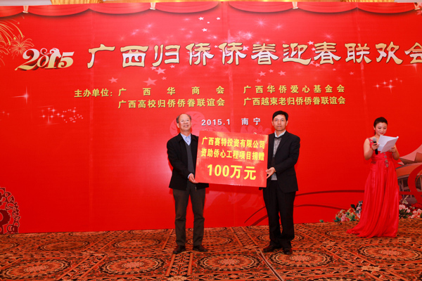 积德行善,是中华民族源远流长的传统美德,怀有仁爱之心谓之慈,广行济困之举为之善,慈善即是仁德与善行的统一。这次盛会,是喜庆的盛会,是温暖的盛会,也是慈善的盛会,广西华商会会长、广西赛特投资有限公司董事长韦生贵先生慷慨解囊,向广西华侨爱心基金会捐赠100万人民币用于侨心工程的建设,广西华侨爱心基金会副理事长韦穗奇同志接受了捐赠。韦生贵董事长多年来不图回报,默默奉献,热心公益,他的爱心,让失学的儿童重返了校园,让贫困的家庭重见了温暖,让优秀的学子奋发图强很多华侨。很多华侨同胞身在国外,根在中国,梦牵魂萦的是家乡的山山水水和父老乡亲。他们的生活富裕了,事业成功了,首先想到的是报答曾有恩于他们的人,进而回报祖国,回报社会,回报家乡。