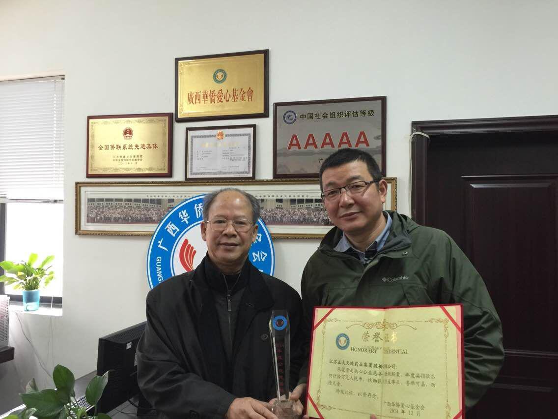图为基金会副理事长韦穗奇同志为江苏正大天晴药业集团股份有限公司颁发“2014年度慈善公益奖”奖杯