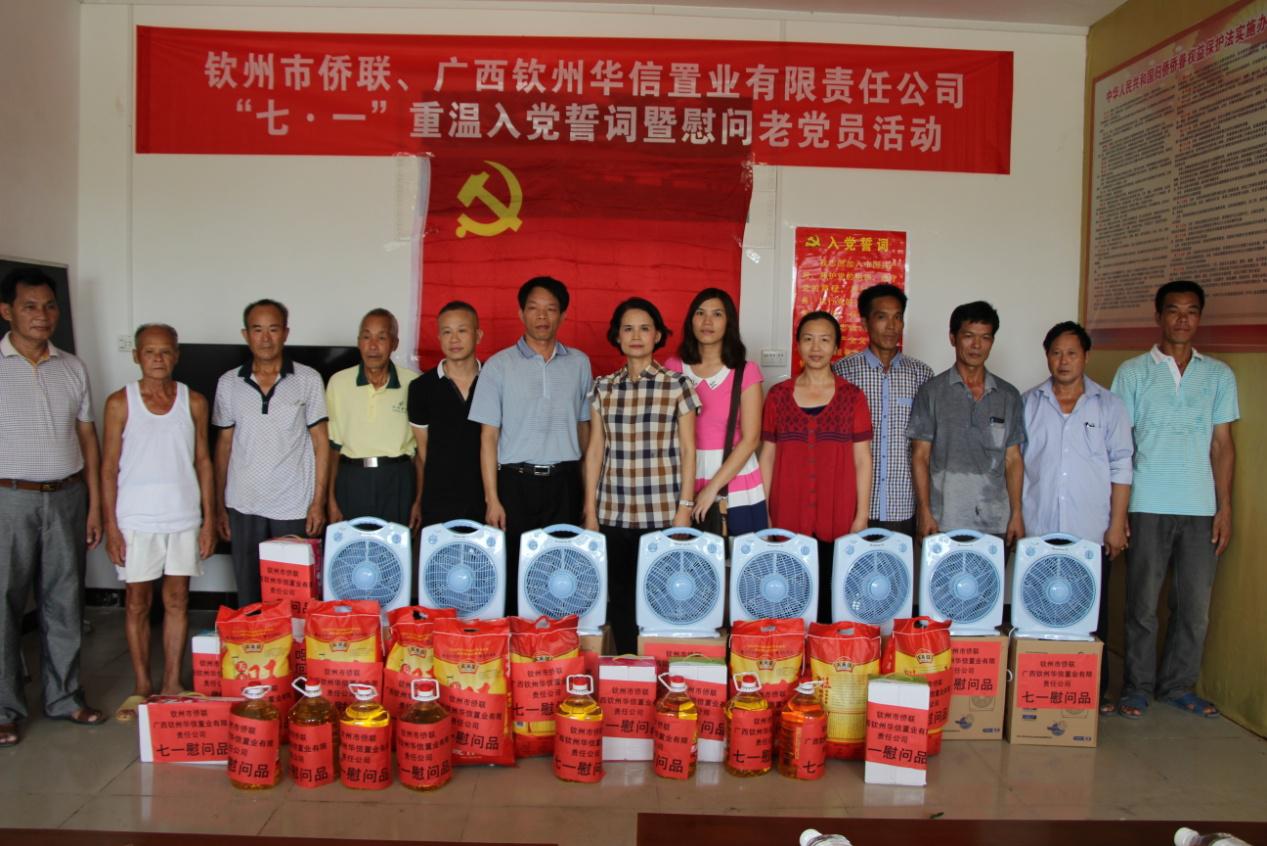 7月1日至2日,钦州市侨联党支部联合广西英华国际职业学院和广西钦州华信置业有限责任公司深入钦南区丽光华侨农场、灵山县东风华侨林场开展“七·一”重温入党誓词暨慰问老党员活动。购买了大米、油、牛奶、电风扇等慰问品,深入基层走访慰问,把党的关怀与温暖送到侨界老党员及困难党员的心坎上。